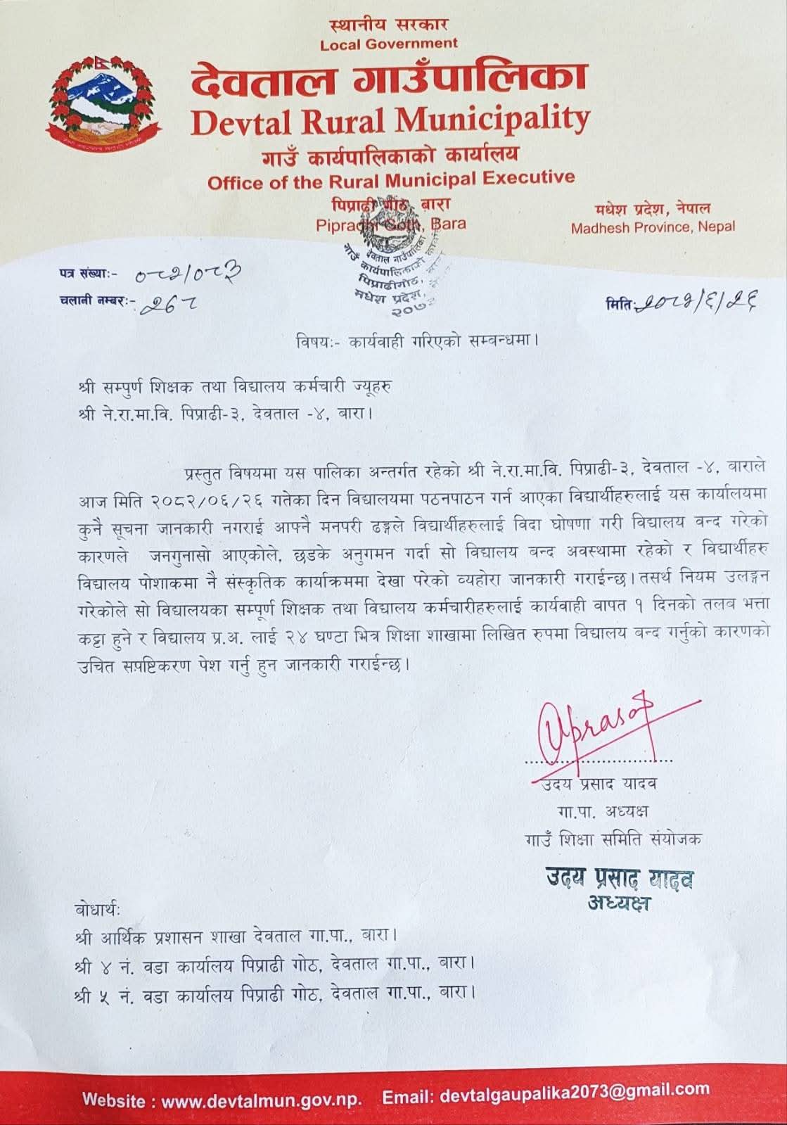 त्यससँगै सम्बन्धित विद्यालयका प्रधानध्यापक लाई २४ घण्टाभित्र शिक्षा शाखामा लिखित स्पष्टीकरण पेश गर्न पनि निर्देशन दिइएको गाउँपालिकाले जनाएको छ ।