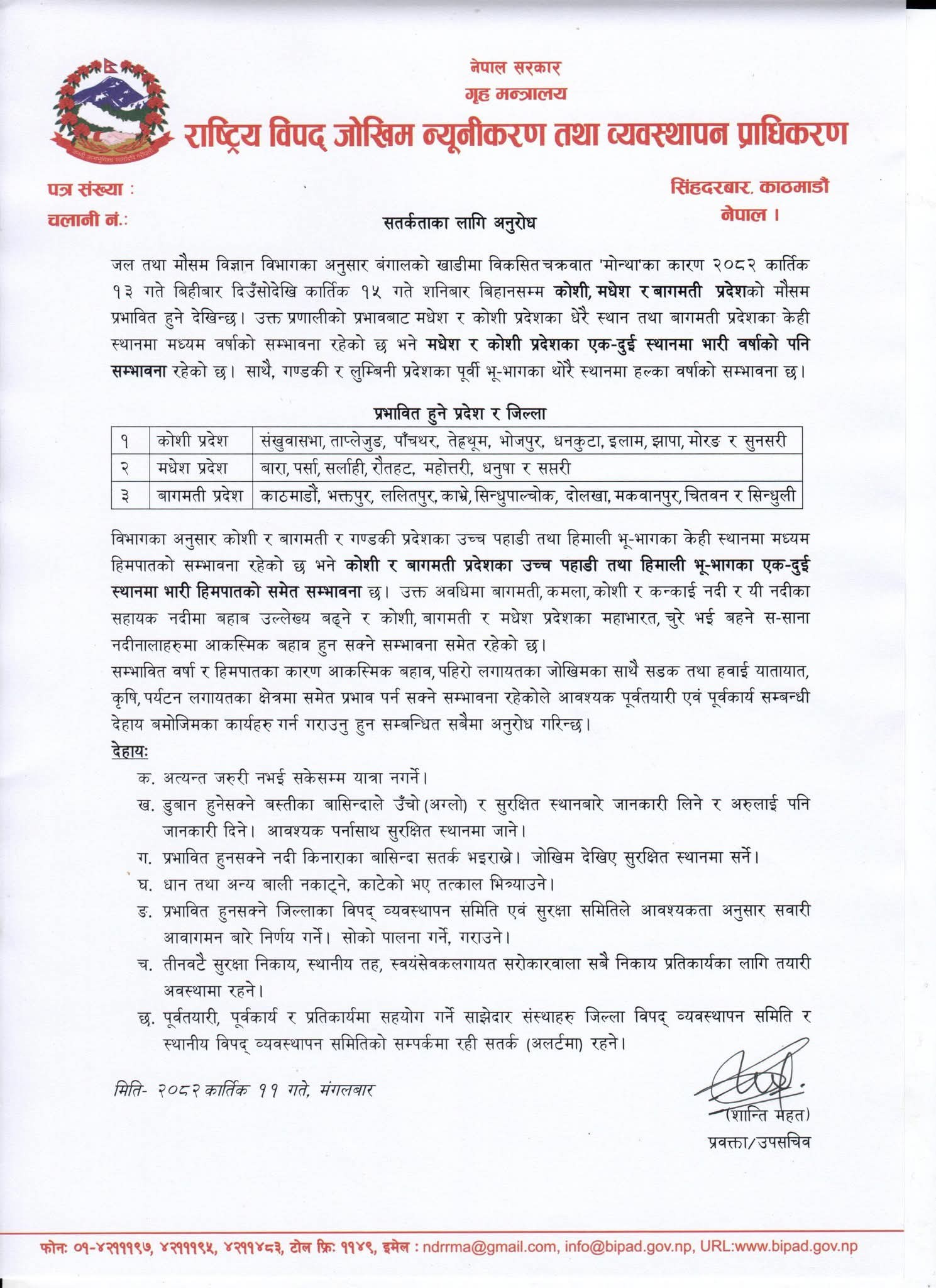 उक्त प्रणालीको प्रभावले मधेश प्रदेश र कोशी प्रदेशका धेरै स्थानमा तथा बागमती प्रदेशका केही स्थानमा मध्यम वर्षाको सम्भावना रहेको प्राधिकरणले जनाएको छ। बारा, पर्सा, सर्लाही, रौतहट, महोत्तरी, धनुषा, सप्तरी, काठमाडौँ उपत्यका, काभ्रे, सिन्धुपाल्चोक, दोलखा, मकवानपुर, चितवन , सिन्धुली, संखुवासभा, ताप्लेजुङ, पाँचथर, तेह्रथुम, भोजपुर, धनकुटा, इलाम, झापा, मोरङ, सुनसरी जिल्ला भई बहने स–साना नदीहरूमा आकस्मिक बहावको सम्भावना उच्च रहेको प्राधिकरणले जनाएको हो ।