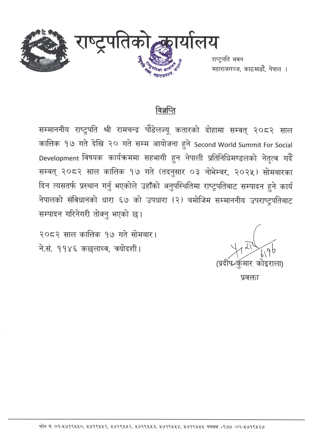 राष्ट्रपतिको कार्यालयका प्रवक्ता प्रदीपकुमार कोइरालाद्वारा जारी विज्ञप्तिमा राष्ट्रपति पौडेलले नेपालको संविधानको धारा ६७ को उपधारा (२) बमोजिम सो अवधिमा राष्ट्रपतिबाट हुने कार्य उपराष्ट्रपतिबाट सम्पादन गरिने गरी तोक्नुभएको उल्लेख छ।