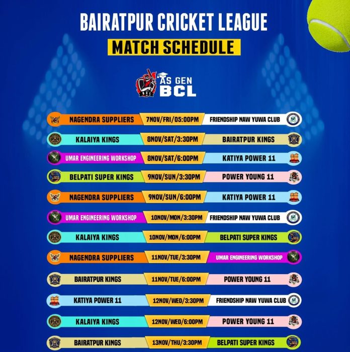 कलैया,१९ कात्तिक । बैराठपुर युथ क्लबको आयोजनामा बाराको बैराठपुरमा बैराठपुर क्रिकेट लिग (बीसीएल) सिजन–१ कात्तिक २१ गतेदे शुक्रबार देखि सुरु हुने भएको छ।