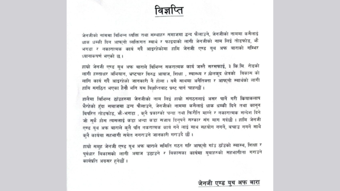 हालैमा बिभिन्न ठाँउहरुमा जेनजीको नाम लिई हाम्रो संगठनलाई असर पार्ने गरी कियाकलाप भैरहेको हुँदा समाजमा द्वन्द फैलाउने, जेनजीको नाममा कसैलाई धाक धम्की दिने तथा कानुन विपरित तोडफोड, झैँ–झगडा कुनै प्रकारको चन्दा तथा फिरौति माग्ने र नकारात्मक सन्देश दिने जो सुकैलाई कार्वाही गर्न जेनजी एण्ड युथ अफ बाराले सरकारसँग माग गरेको छ ।
