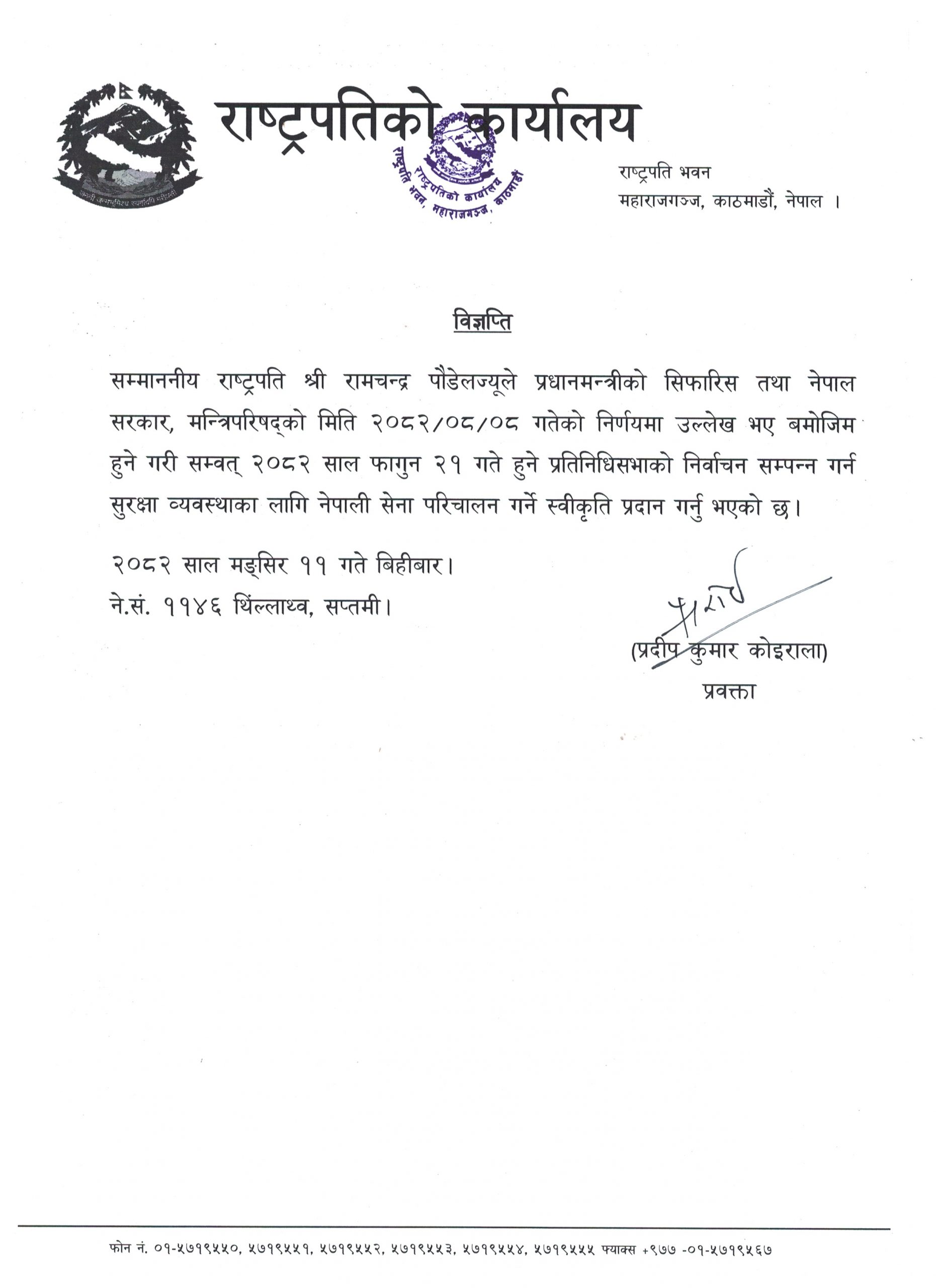 कलैया, ११ मंसिर। आगामी फागुन २१ गते हुने प्रतिनिधिसभा निर्वाचनका लागि नेपाली सेना परिचालन गर्न राष्ट्रपति रामचन्द्र पौडेलले स्वीकृति दिएका छन् ।